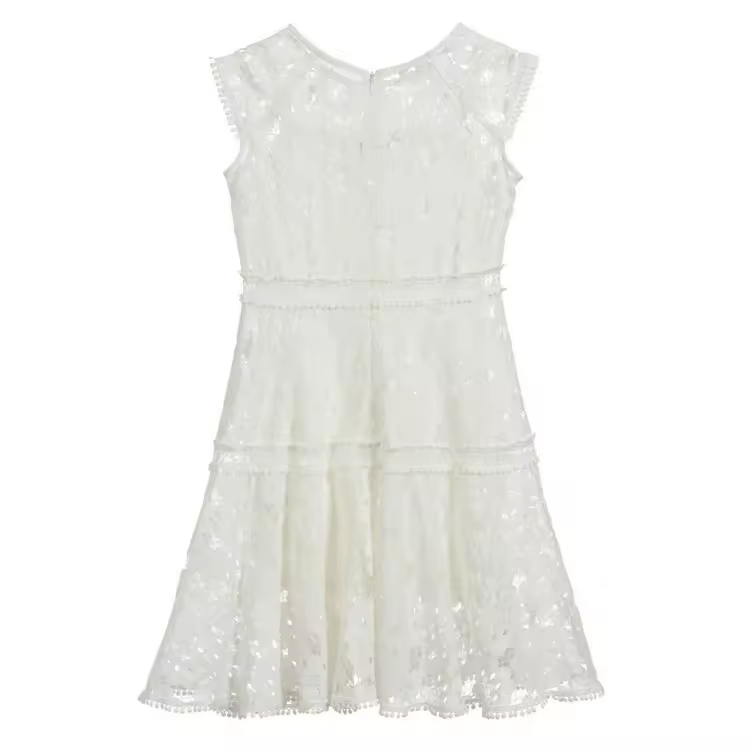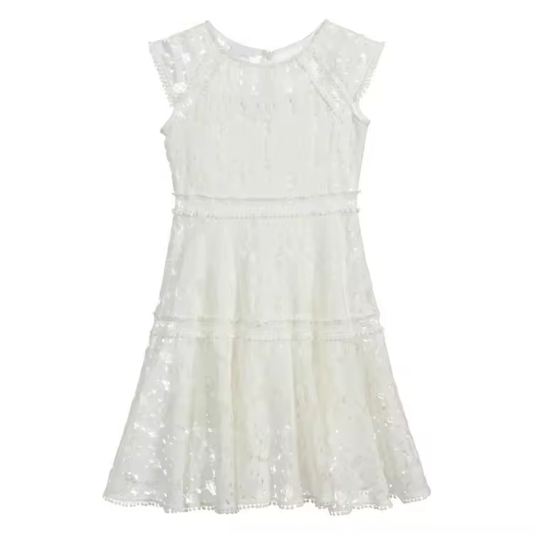 2025 OEM High End Design Floral Lace Short Sleeve Kids White Party Dresses Knee Length Cotton High Waist Summer Dress for Girl