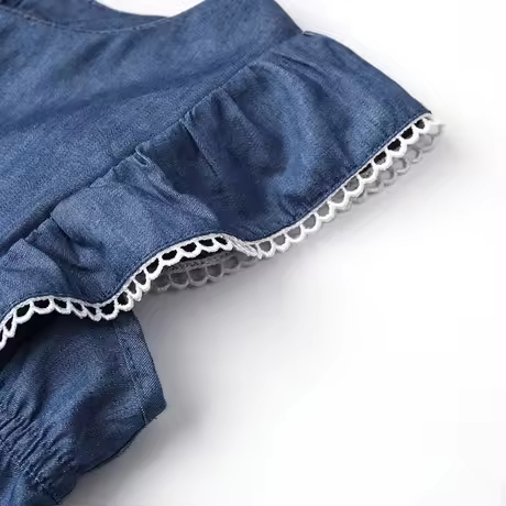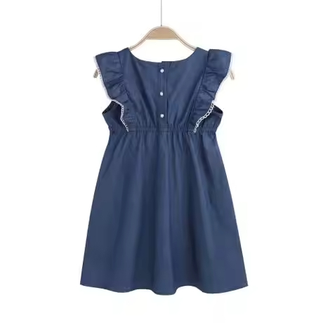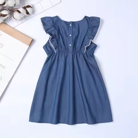 Children's Summer Dress Girl's Dress European and American Children's Dress Pure Color Denim Skirt Round Collar Lotus Leaf Edge