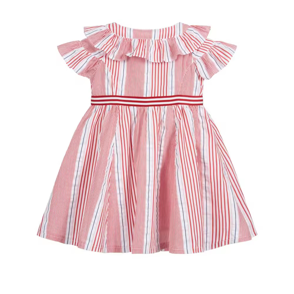 /Customized Newest Design Buttons Front Ruffles Collar Dresses Kids Woven Cotton Yarn Dyed pink White Stripes Girl Dress