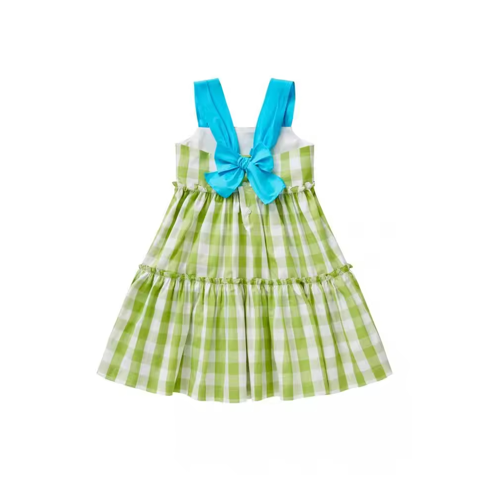 Custom Children Girl Fashion Summer Cotton Bow Green Plaid Dress Kids Casual Sleeveless Sling Dress